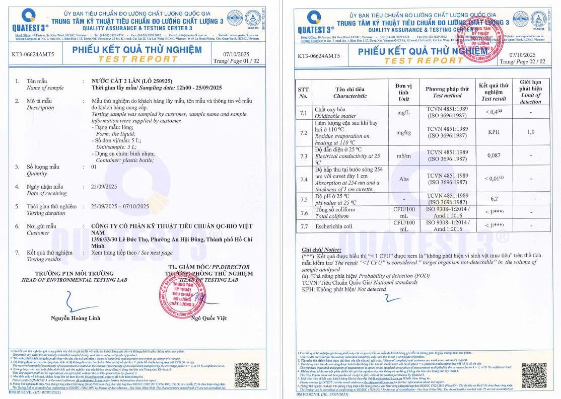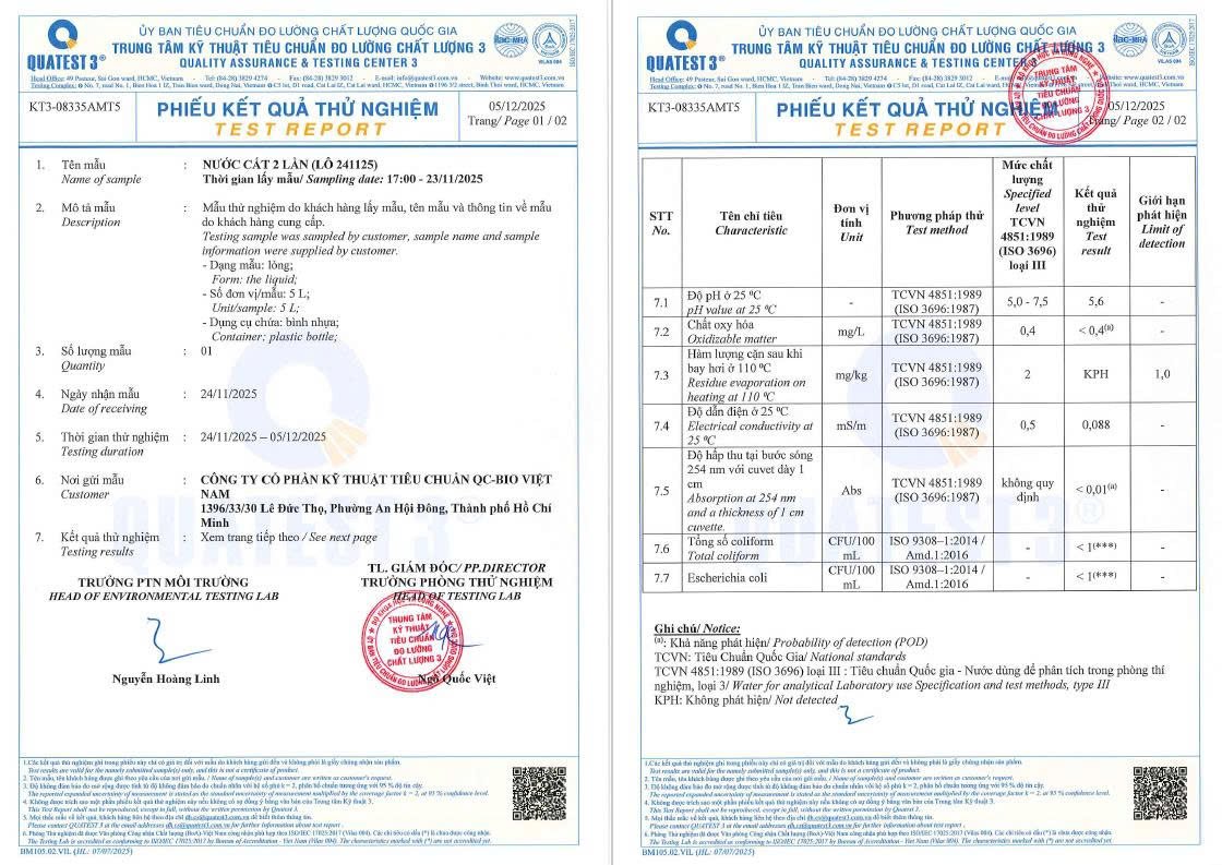 Nước cất đạt tiêu chuẩn ISO 3696:1987 và ASTM D1193 đòi hỏi hệ thống xử lý đầu vào, chưng cất, ngưng tụ và kiểm nghiệm hoàn chỉnh. Mỗi mẻ đều phải được kiểm tra chất lượng và đối chứng với đơn vị độc lập như QUATEST 3. Chi phí đầu tư thiết bị và kiểm nghiệm là yếu tố tác động trực tiếp đến giá thành.